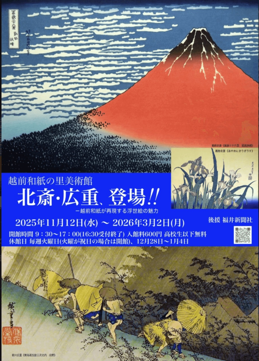 隨著2025年NHK大河劇以「江戶媒體王」蔦屋重三郎為主角,浮世繪再度成為日本藝術界的焦點。位於福井縣越前市的越前和紙の里美術館,推出結合傳統工藝與經典藝術的浮世繪企畫展,透過越前和紙重新詮釋葛飾北斎、歌川廣重等名家的代表作,帶領觀眾從嶄新視角感受浮世繪多樣化的魅力。